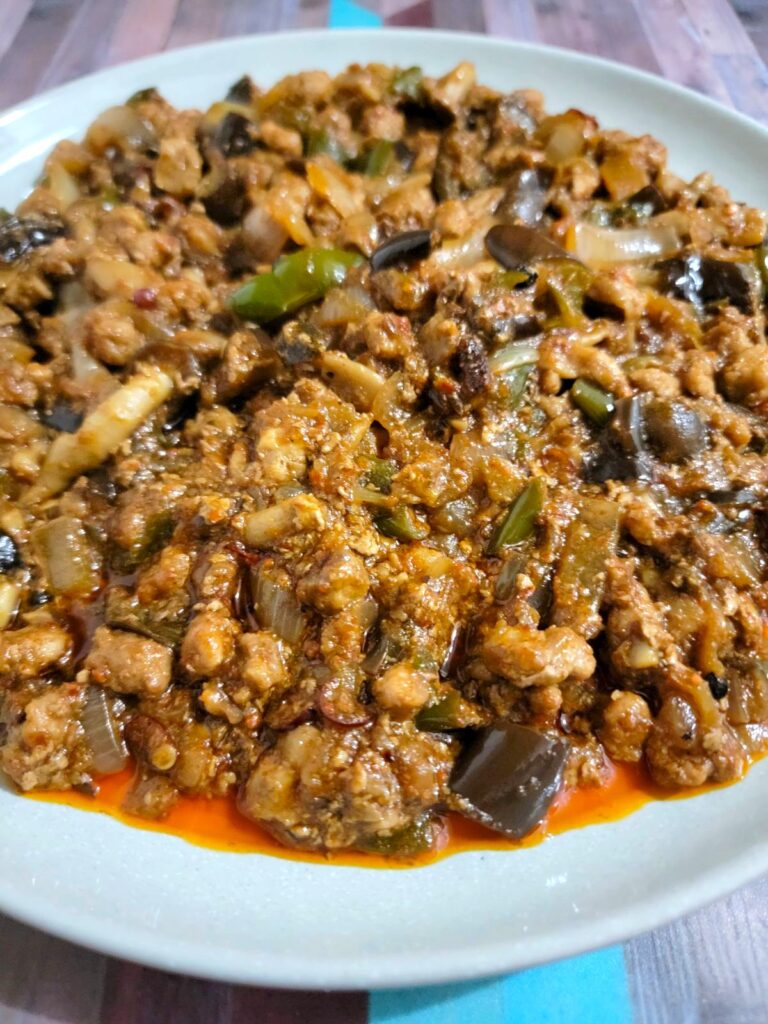 庭の秋茗荷とお値下げ品の国産豚荒挽き肉、秋ナス、ブナシメジ、玉葱、ピーマンをオリーブオイルで炒めて、赤唐辛子、ニンニク、クミン、コリアンダー、チリペッパー、オレガノ、ブラックペッパー、ピンクペッパー、ソース、塩コショウのカレーソースと煮込んだ秋キーマカレー🍁